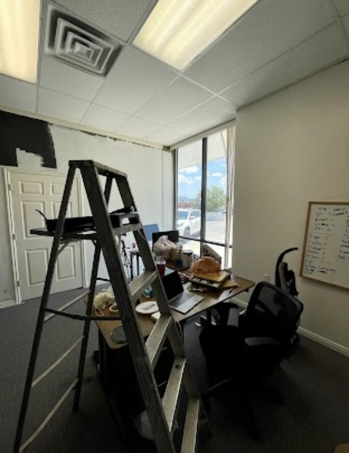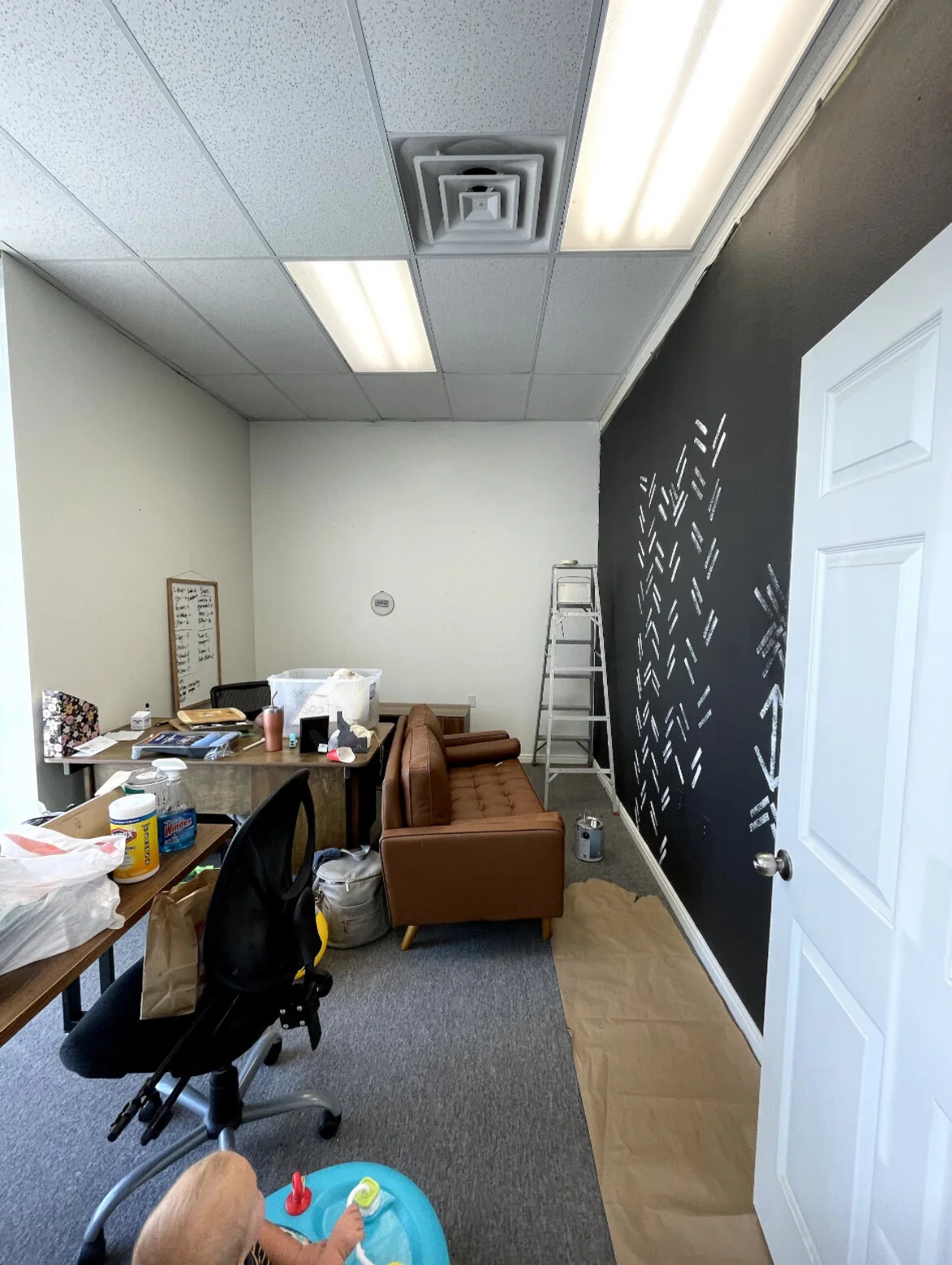 It is about time we moved out of our basement and into our own office! Itβs located inside of our brokerageβs office but we never had a dedicated space for ourselves. I love that we are working with a nice square shape with some floor to ceiling windows. The tenant before us starting painting the walls black but never finished. It inspired me to use Sherwin Williams Iron Ore on the walls.