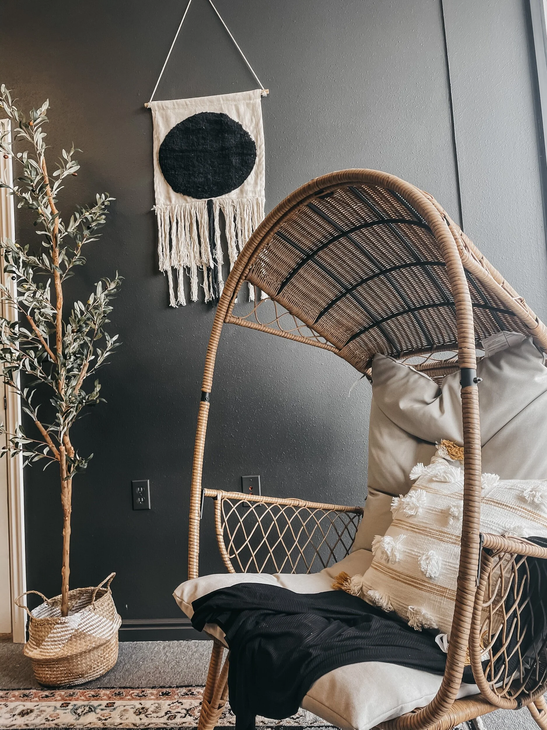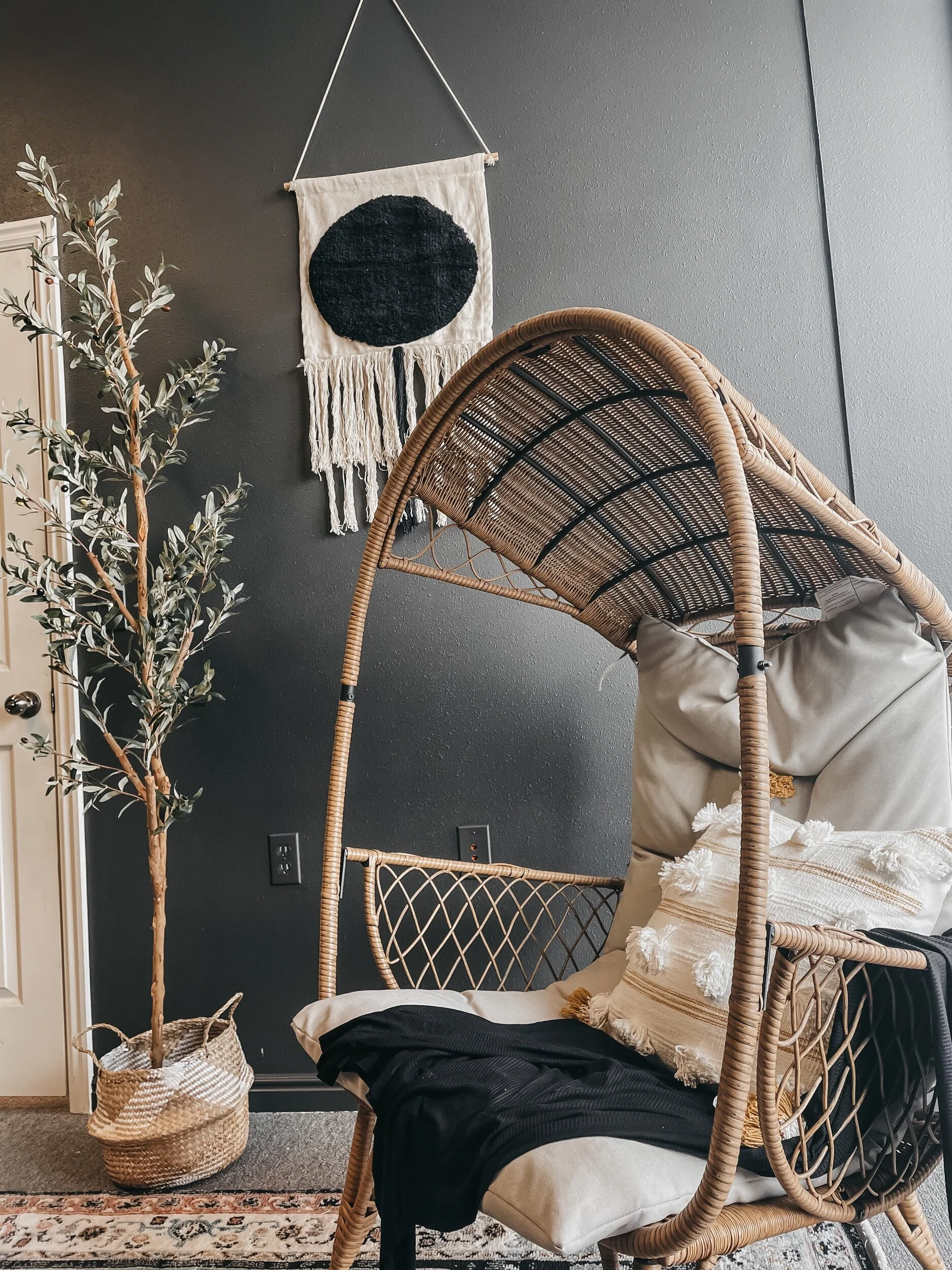 My brown chair, wall hanging, and cream/yellow pillow are from Ross Dress for Less. My basket for the tree is from a local decor shop. I made my sign with my Glowforge Laser Printer.