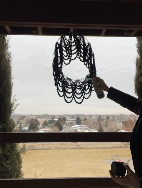 Once all beads are in place, spray paint away! I had a hook on my deck that was helpful with this. Make sure you spray at all angles so you cover all of the dark blue on the beads as well as the white string. After spraying I dabbed a little E6000 glue on each knot to make sure they didn’t come untied.