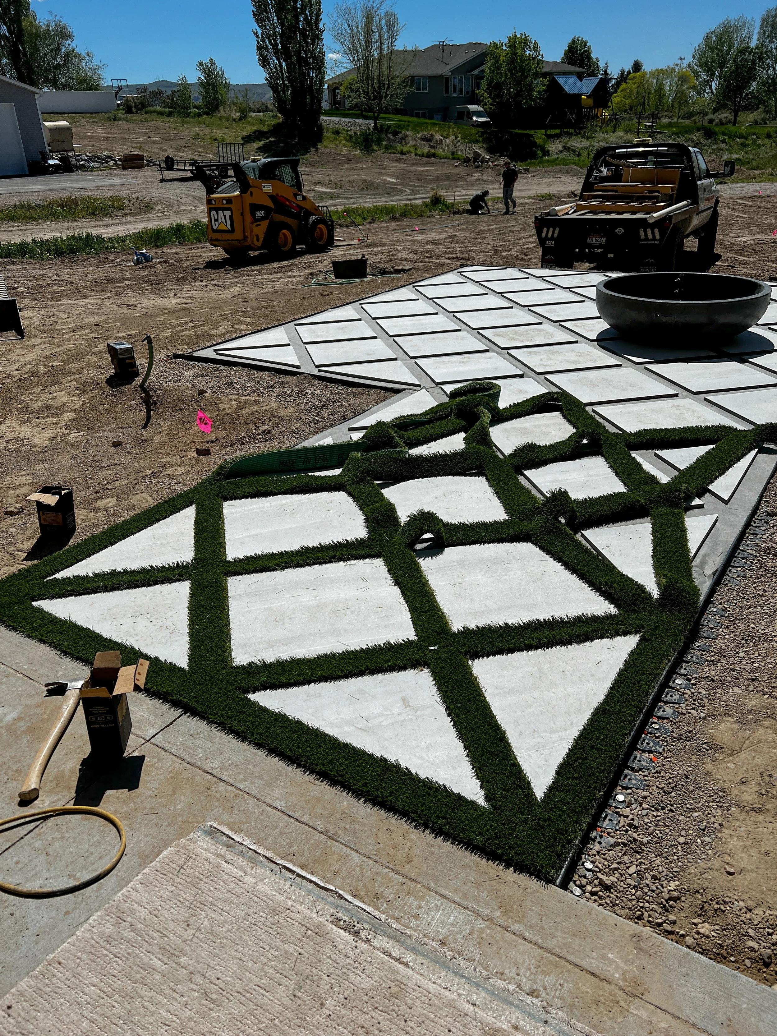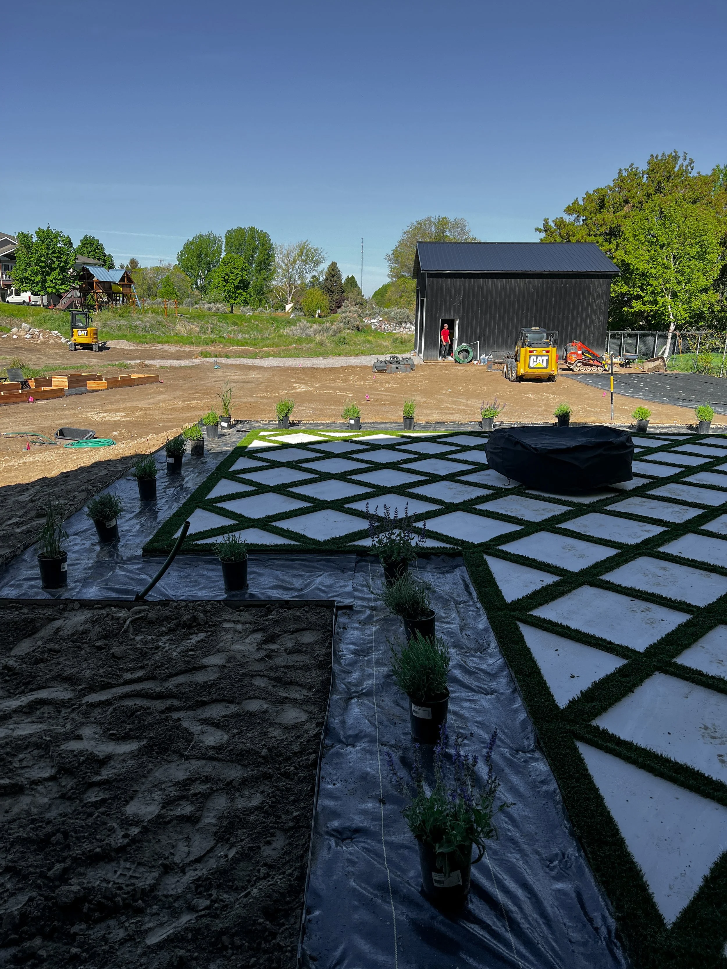 The ground has to be prepped and leveled correctly, then you can roll out the template/weed barrier (it’s the same material), place the pavers, and finally roll out the turf into the spaces and nail it down. It also requires infill. The company is really great about educating you on all the steps.