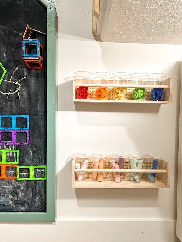 As soon as it was hung both of our kids got right to work making their masterpieces. I made sure to have a spot to store the chalk and magnetic letters-I went with these Bullseye Playground shelves for $5 each from Target!